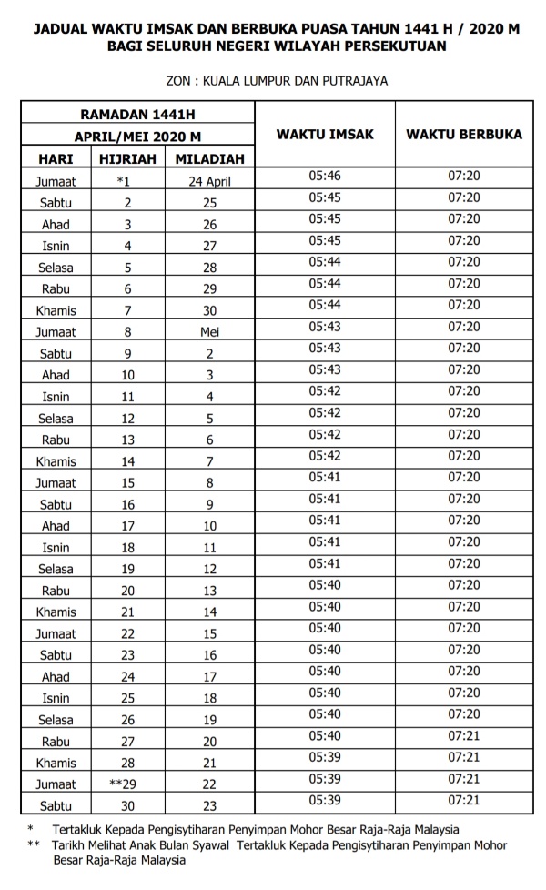 Jadual Waktu Imsak Dan Berbuka Puasa Kuala Lumpur Putrajaya Tahun 2020 In 2020 Putrajaya Kuala Lumpur Ramadhan