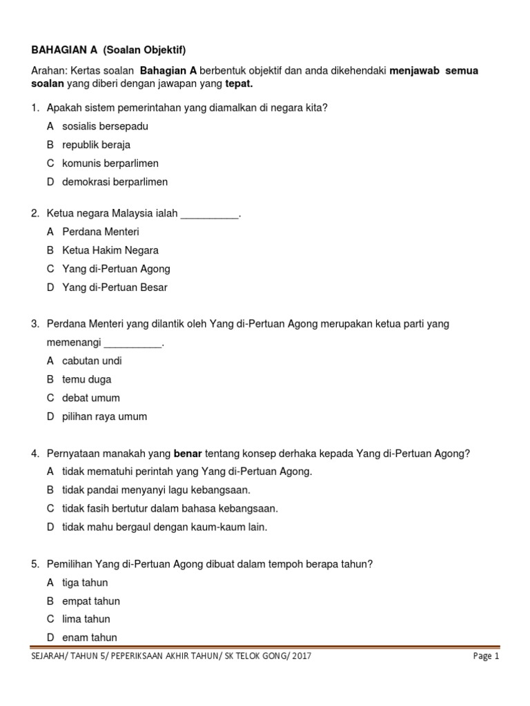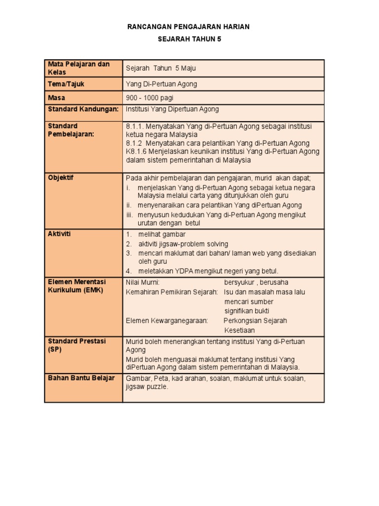 Rph Sejarah Tahun 5 Yang Dipertuan Agong