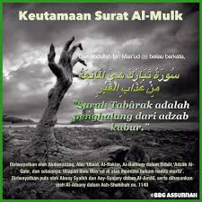 Jom ketahui kelebihan surah al mulk ini. Kelebihan surah al mulk bnu abbas berkata. Pada suatu hari ada seseorang menghampar jubahnya di atas kuburan dan ia tidak tahu bahwa tempat itu adalah kuburan ia membaca surat al mulk kemudian ia mendengar suara jeritan dari kuburan itu. Untuk keutamaan seperti yang telah dijelaskan oleh yusuf mansur marilah kita selalu mengamalkan membaca surat ini secara istiqomah agar menjadi penyelamat siksa kubur.