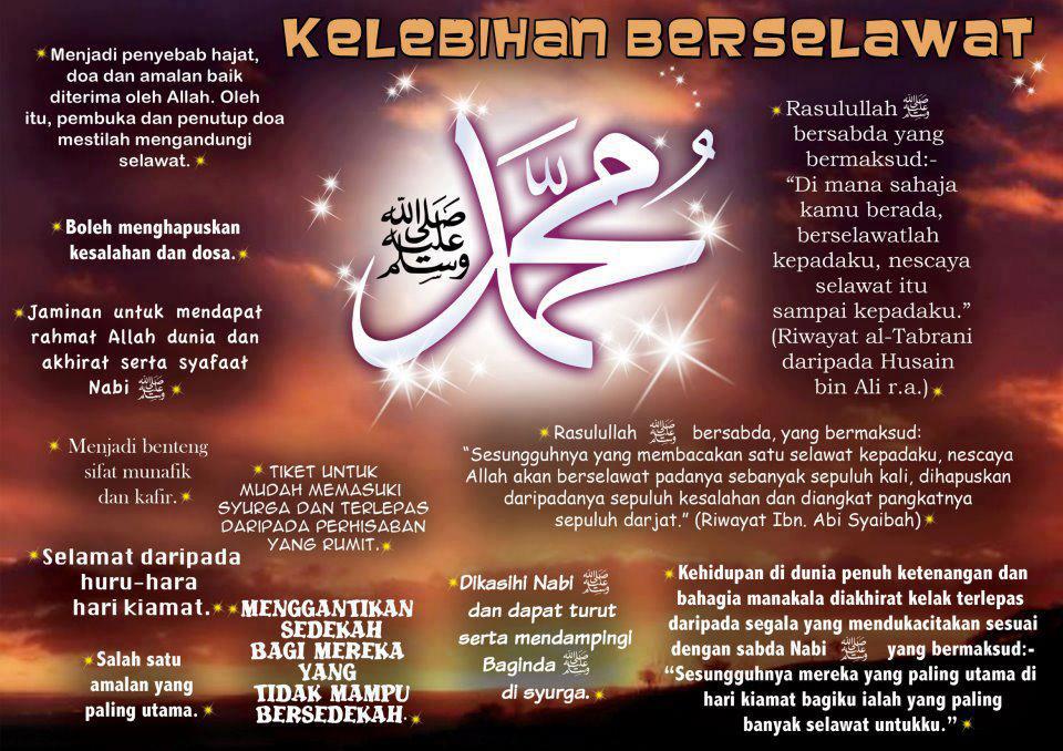 Kelebihan selawat keatas nabi muhammad saw. Kelebihan selawat ke atas nabi muhammad saw sebagai umat islam banyak kelebihan yang diperolehi jika kita berselawat kepada junjungan besar nabi muhammad saw. Wahai orang orang yang beriman berselawatlah kamu kepadanya serta ucapkanlah salam sejahtera dengan penghormatan yang sepenuhnya. Ini kerana kita sangat memerlukan syafaat apabila dihimpunkan di padang mahsyar kelak. Bacaan selawat ke atas nabi muhammad saw.