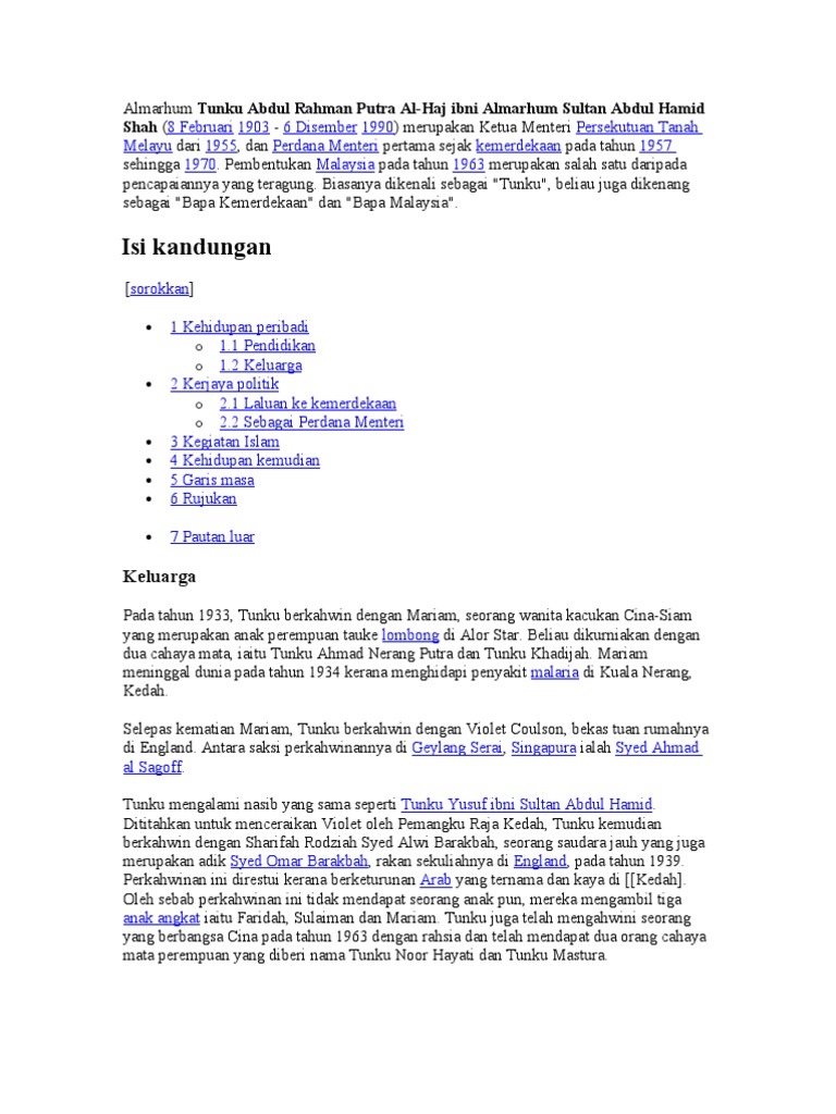 Biodata Tokoh Malaysia Biodata Tunku Abdul Rahman Bapa Kemerdekaan Dan Bapa Malaysia