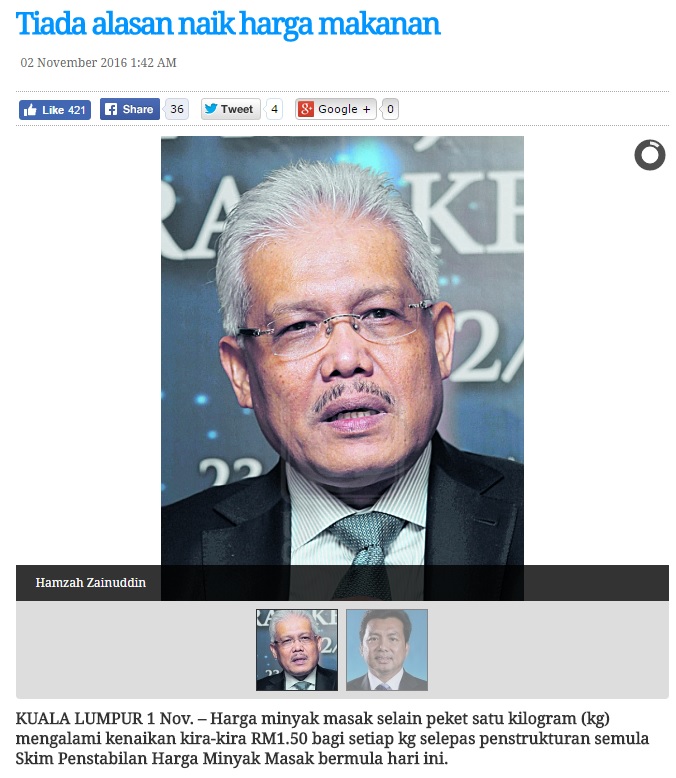 Kenaikan harga minyak masak. Berikut dikongsikan harga terkini minyak masak di malaysia bermula dari 1 november 2016 seperti yang diumumkan oleh kerajaan. Juga produk minyak campuran serta produk minyak sawit tulen yang dijual dalam botol yang lebih besar. Namun begitu sekiranya harga minyak dunia meningkat harga petroleum akan dihadkan dan dikawal kepada rm2 20 seliter bagi ron95 dan juga rm2 18 bagi diesel sehingga pelaksanaan subsidi petrol secara bersasar dijalankan pada 2019. Penstrukturan semula minyak masak itu dilakukan berikutan kenaikan harga minyak sawit yang diproses olein di pasaran dunia.