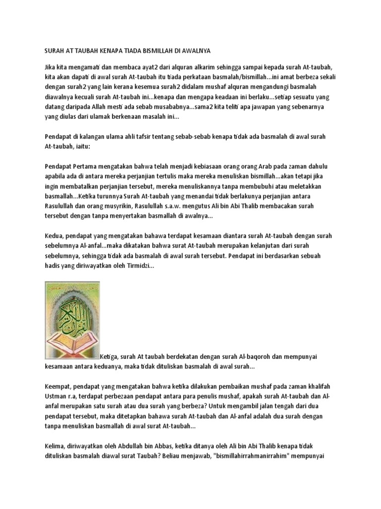 Kenapa surah at taubah tiada bismillah. Mengapa di awal surat at taubah tidak ada basmalah. Kenapa tiada basmallah bismillah diawalnya. Kenapa surah at taubah tiada bismillah november 5 2019 suara marhean islamic comments off on kenapa surah at taubah tiada bismillah ini jawapan dr yusuf qardawi yang buat ramai umat islam tak sangka khalifah mail online bagi yang pernah qatam baca al quran mesti perasan yang surah at taubah tidak didahului dengan kalimah bismillah. Bismillah was shalatu was salamu ala rasulillah wa ba du ada dua versi penjelasan mengapa di surat at taubah tidak diawali dengan bacaan basmalah.