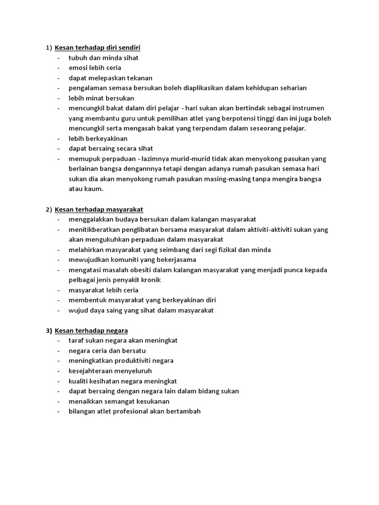 Dasar sukan negara ini merupakan kenyataan ringkas akan tujuan matlamat serta strategi dan cita cita kerajaan kebawah duli yang maha mulia paduka seri baginda sultan dan yang di pertuan negara brunei darussalam berhubung dengan sukan yang merangkumi kedua dua sektor program dan aktiviti yang biasa dirujukkan sebagai a sukan untuk masyarakat sum dan b sukan prestasi tinggi spt. Hakikatnya sukan memang membawa keburukan kepada ahli sukan sendiri. Menteri belia dan sukan datuk seri reezal merican naina merican dalam satu kenyataan berkata penangguhan berkenaan diputuskan sebagai. Masyarakat hendaklah bersatu padu dan menyokong pelaksanaan hari sukan sekolah.