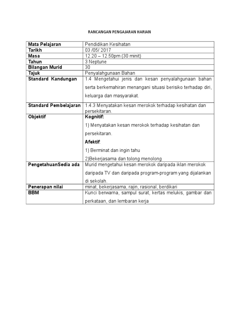 Rancangan Pengajaran Harian Pendidikan Kesihatan