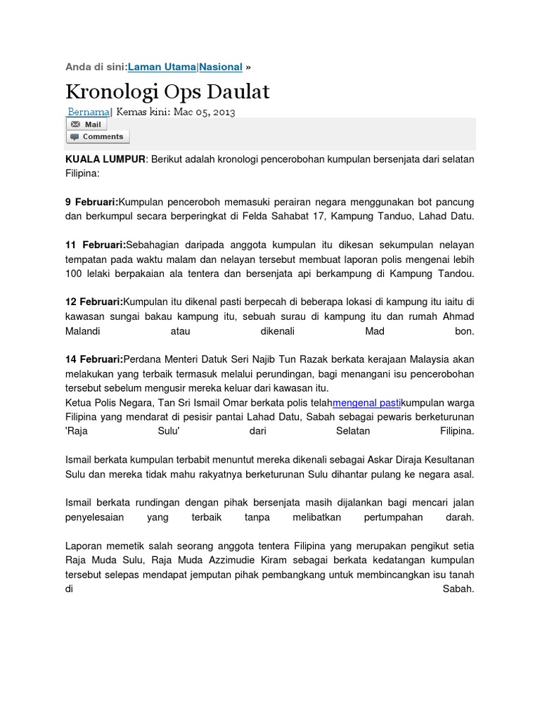 Skip navigation sign in. Berikut adalah rentetan peristiwa yang berlaku sejak 9 februari lalu sehingga hari ini. Terima kasih kerana membaca kronologi pencerobohan tentera sultan sulu di kampung tanduo lahad datu sabah penafian. Sebahagian daripada anggota kumpulan itu dikesan sekumpulan nelayan tempatan pada waktu malam dan nelayan tersebut membuat laporan polis mengenai lebih 100 lelaki berpakaian ala tentera dan bersenjata api berkampung di kampung tandou.