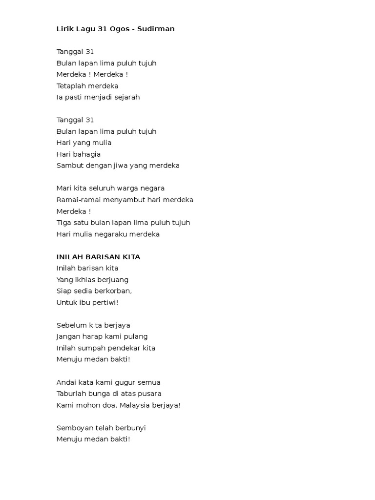 Lagu tanggal 31 ogos. Tanggal 31 bulan lapan lima puluh tujuh merdeka. Tetaplah merdeka ia pasti menjadi sejarah. Lirik lagu 31 ogos sudirman. Tanggal 31 bulan lapan lima puluh tujuh hari yang mulia hari bahagia sambut dengan jiwa yang merdeka.