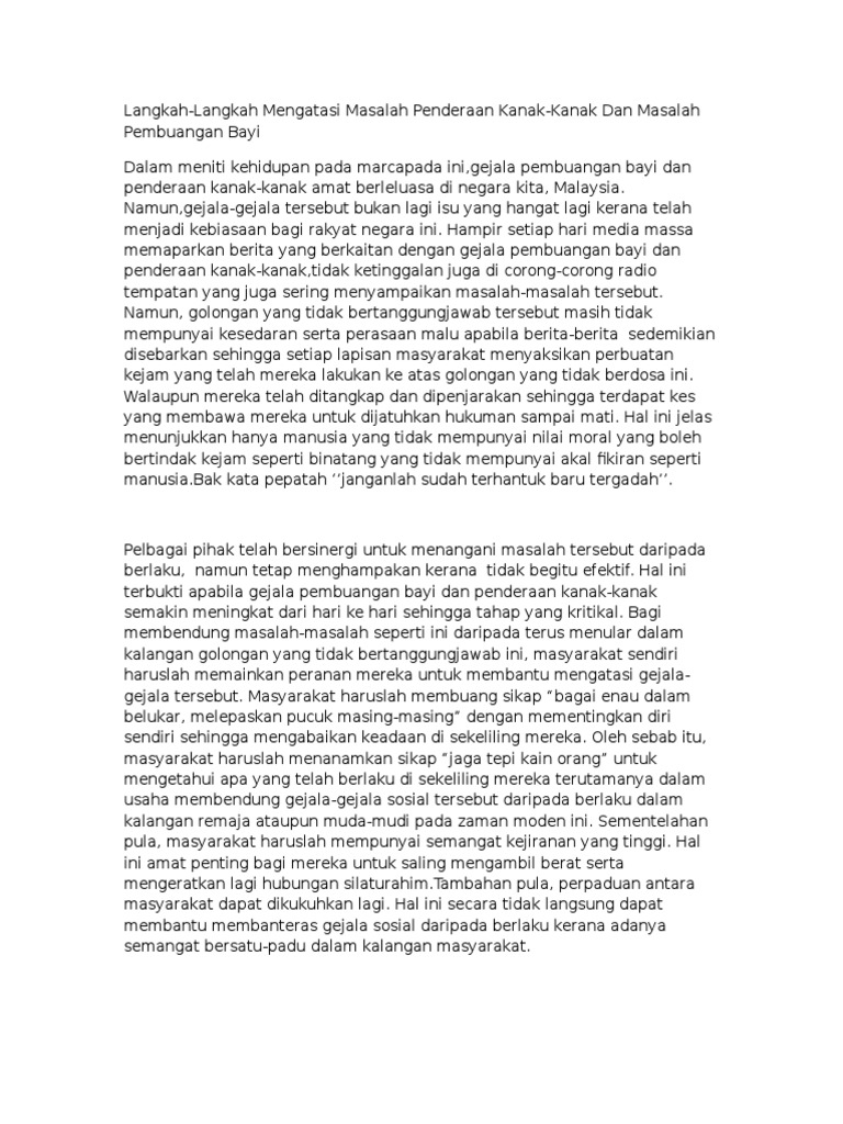 Langkah mengatasi penderaan kanak kanak. Kesimpulannya kita harus peka terhadap kes penderaan kanak kanak yang semakin serius di negara kita. Masalah penderaan terhadap kanak kanak haruslah dibendung kerana perkara seumpama ini akan meruntuhkan institusi kelurga. Jika sabit kesalahan seseorang itu boleh dihukum denda tidak melebihi rm20 000 atau penjara tidak melebihi 10 tahun atau kedua duanya sekali. Langkah langkah mengatasi masalah penderaan kanak kanak dan masalah pembuangan bayi dalam meniti kehidupan pada marcapada ini gejala pembuangan bayi dan penderaan kanak kanak amat berleluasa di negara kita malaysia.