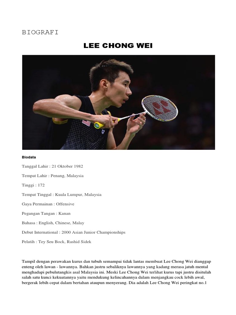 34 tahun 2016 asal. Lee merangkul pingat perak di temasya sukan olimpik 2008 dan 2012 dan 2016 maka menjadi rakyat malaysia pertama yang layak ke pusingan akhir acara perseorangan lelaki sekaligus menamatkan. Biodata dato lee chong wei nama penuh.