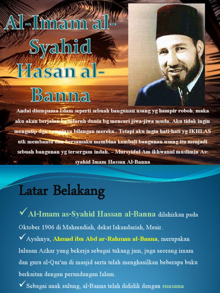 Latar belakang hassan al banna. Hasan al banna dilahirkan di desa mahmudiyah kawasan buhairah mesir tahun 1906 m. He was also heavily influenced by sufism as a youth in mahmudiyya. حسن أحمد عبد الرحمن محمد البنا atau ringkasnya hassan al banna adalah pendakwah reformis sosial dan politik mesir dan pengasas gerakan ikhwanul muslimin pada usia 12 tahun beliau sudah menghafal al quran beliau menyertai kumpulan latihan akhlak dan jemaah al suluka al akhlaqi di sekolah. Beliau berasal dari sebuah keluarga ulama yang dihormati dan terkenal kerana begitu kuat mentaati ajaran dan nilai nilai islam.