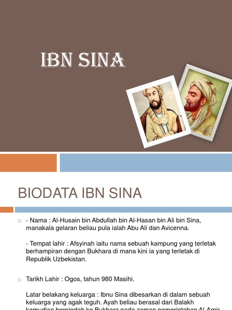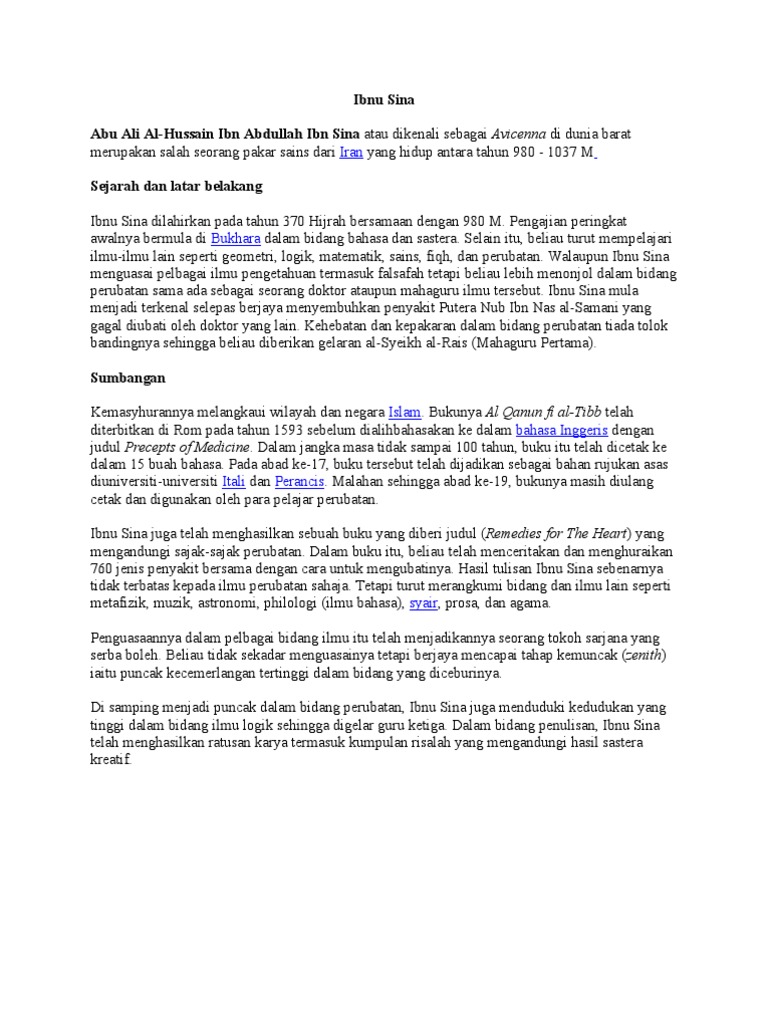 Pada usia 17 tahun dengan kepintarannya ibnu sina telah menguasai teori dari ilmu kedokteran yang ada pada saat itu. Latar belakang ibnu sina ibnu sina yang lebih dikenali di barat dengan nama avicenna mempunyai nama lengkap abu ali al huseyn bin abdullah bin hassan ali bin sina. Selain itu beliau turut mempelajari ilmu ilmu lain seperti geometri logik matematik sains fiqh dan perubatan. Ibnu sina sejak muda telah menguasai beberapa disiplin ilmu seperti matematika logika fisika kedokteran astronomi hukum dan lain lain.