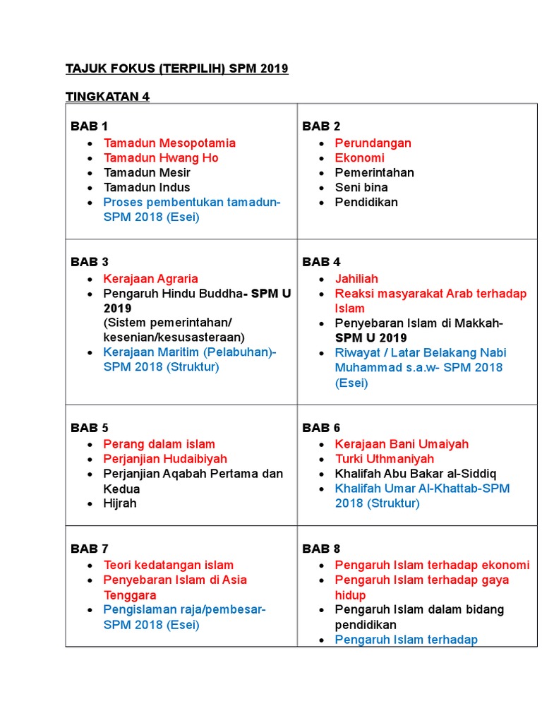Tajuk Fokus Terpilih Spm 2019 Tingkatan 4 Bab 1 Bab 2
