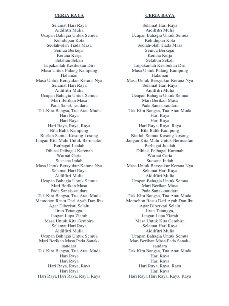 Lirik lagu ceria raya. By admin posted on june 20 2017. Jangan lupa dapatkan patung mainan pat mang atau las di aeon mall atau pusat beli belah aeon berh. Berikut ini lirik lagu raya tnb 2017 ceria di hari raya dugaan raya aida yang tentu saja sedang kamu cari cari. Berikut ini yang mungkin masih berkaitan dengan.