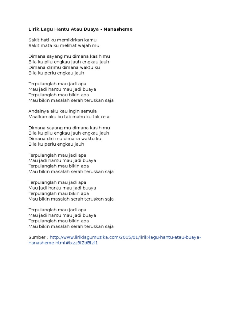 Hantu atau buaya nanasheme lyrics lirik hantu atau buaya sakit hati ku memikirkan kamu sakit mata ku melihat wajah mu dimana sayang mu dimana kasih mu bila ku pilu engkau jauh engkau jauh dimana dirimu dimana waktu ku bila ku perlu engkau jauh terpulanglah mau jadi apa mau jadi hantu mau jadi buaya terpulanglah mau bikin apa.