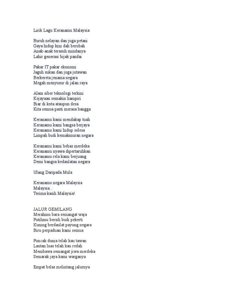 Lirik Lagu Kebangsaan Malaysia 2020