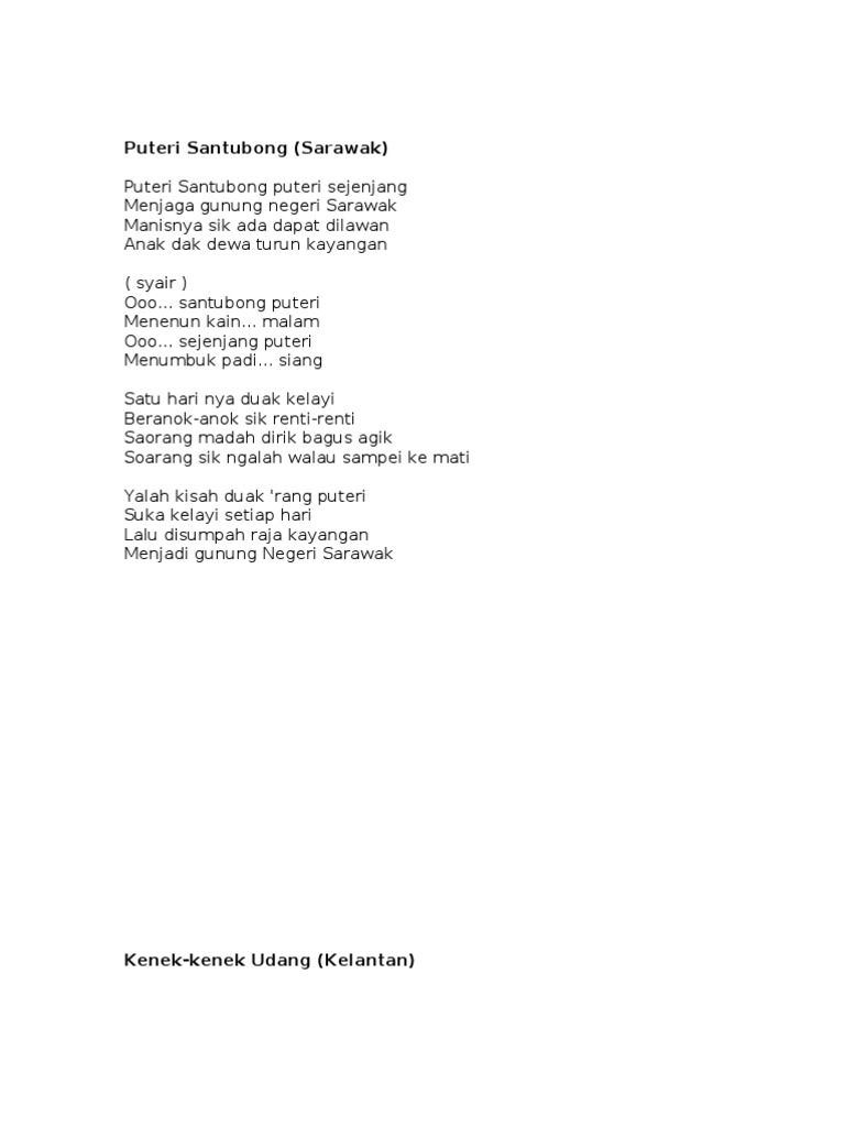 And credits to my lecture and also friend for teaching me and help me much to produce th. Koleksi lirik lagu rakyat puteri santubong puteri santubong puteri sejenjang penjaga gunung negeri sarawak manis sik ada dapat dilawan anak dak dewa turun kayangan. They were ordered to keep the peace in both villages besides helping them. So bagi yang kurang hafal kurang faham maksud lagu tu apa kata kita nyanyi sama2 sambil cuba memahami dan menghayatinya.