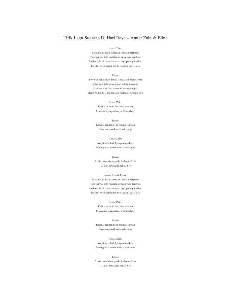 Selamat aidil fitri kepada saudara serta saudari setahun hanya sekali merayakan hari yang mulia ini di masa bulan ramadan kita berpuasa hingga sebulan pabila syawal menjelma hari raya disambut dengan gembira korus 1 miskin kaya memakai baju baru warna warni mengunjungi sanak kaum famili sungguh hebat pemandangan di hari raya ini tua muda wajah.