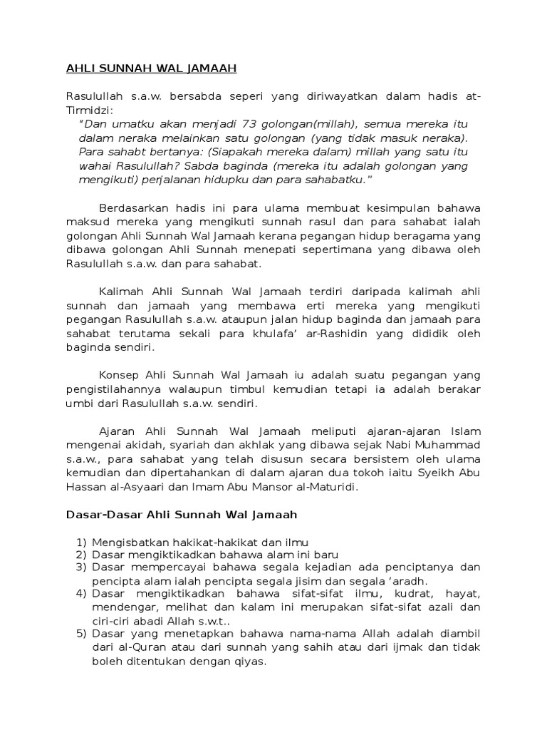 Maka dihukumkan iktiqad ahli sunnah wal jamaah dengan sebenar benar dan pertengahan kerana ia mengadakan perkara yang ada dan mentiadakan yang tiada berkata ahli sunnah pada hamba itu ada usaha kerana sebenarnya ada usaha pada hamba dan mereka itu menidakkan hamba itu tergagah semata mata kerana sebenarnya jua hamba itu tidak tergagah semata mata dan sebab dihukumkan iktiqad ahli sunnah wal jamaah itu pertengahan kerana ia tidak sangat kendur berjela jela seperti jabariah dan tidak. 21 karya syaikh salim bin ied al hilali dan mujmal ushuul ahlis sunnah wal jamaa ah fil aqiidah. Golongan ahli sunnah wal jamaah imam abdul qohir al baghdadi.