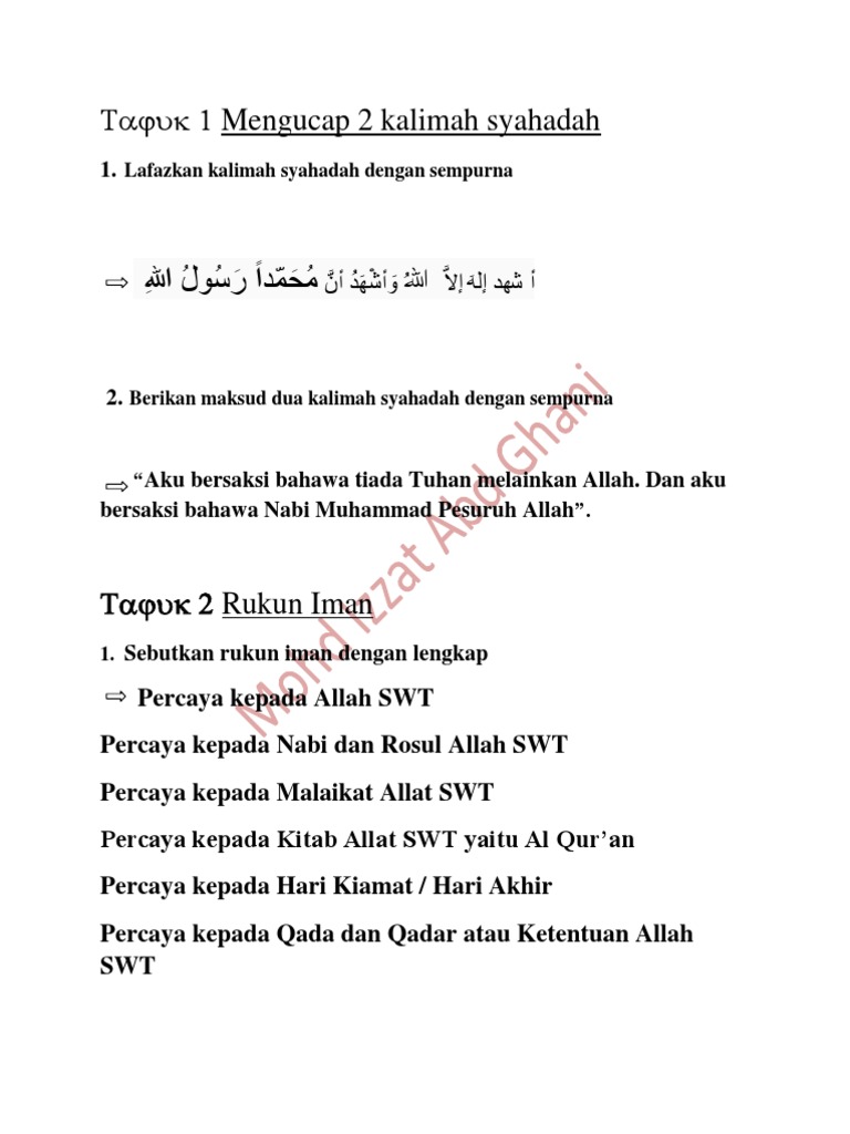 Dia perlu belajar melafazkan dua kalimah syahadah serta perkara perkara yang telah disebut tadi. Melafazkan kedua dua kalimah syahadah dengan berturut turut tanpa diselangi perbuatan lain mamahami makna kedua duanya mengikut bahasa yang difahami. 1 3 syahadah pertama laa ilaaha illallah syahadah pertama ialah mengucapkan tiada tuhan selain allah. Tidak syak atau ragu ragu akan kedua duanya.