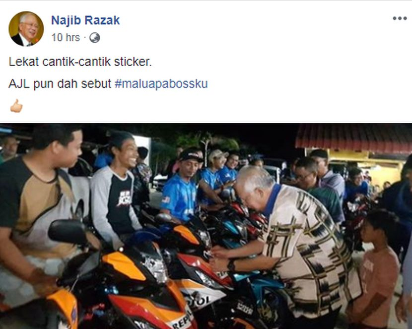 Malu apa bossku sticker. Tagline yang dipopularkan oleh bekas perdana menteri dato sri najib razak ini menjadi semakin hangat apabila seorang budak lelaki ditahan oleh polis kerana menggunakan tagline bossku sebagai nombor plat. Bossku menjadi satu trending dan jadi satu medan business. It s been seen on t shirts and stickers plastered across the klang valley and has made its way into our collective vocabulary. Malu apa bossku refers to a reply made by najib in a now viral selfie video of him alongside a long haired man calling out boss kita our boss and the phrase has now not only turned into a rallying cry among the supporters of the scandal plagued pekan mp but has entered popular culture.