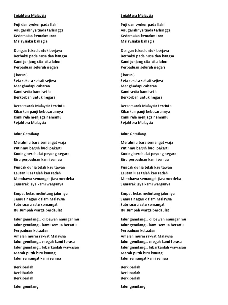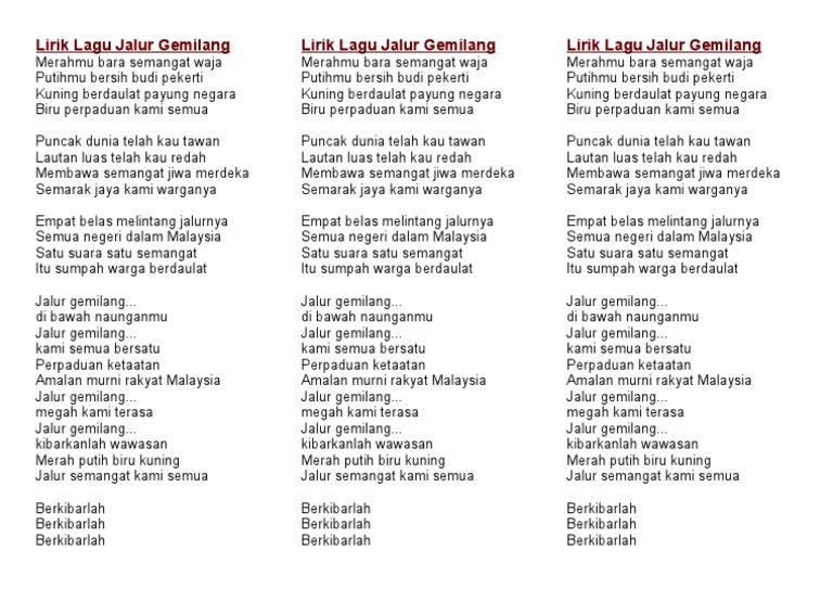 Merahmu bara semangat waja putihmu bersih budi pekerti kuning berdaulat payung negara biru perpaduan kami semua. Lirik lagu malaysia bersih gemersik chorus. Lirik lagu jalur gemilang lagu patriotik. Puncak dunia telah kau tawan lautan luas telah kau redah membawa semangat jiwa merdeka semarak jaya kami warganya.